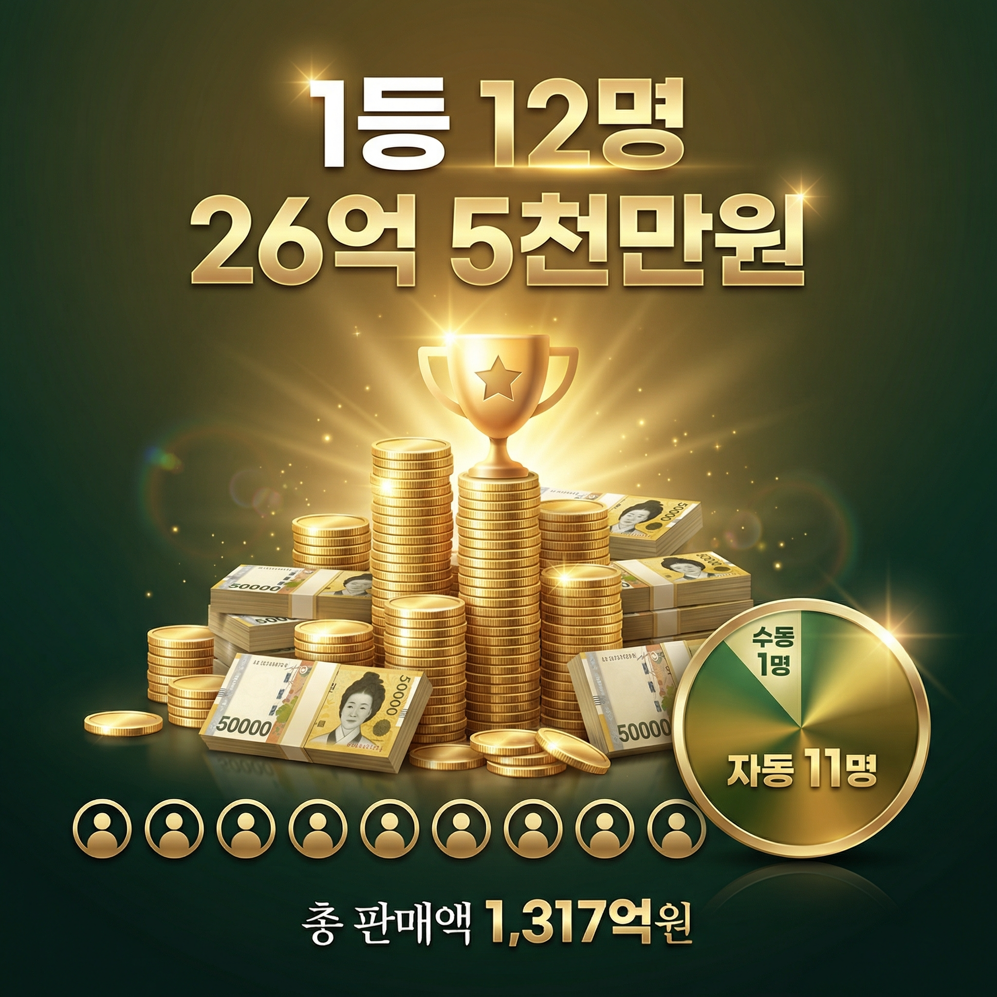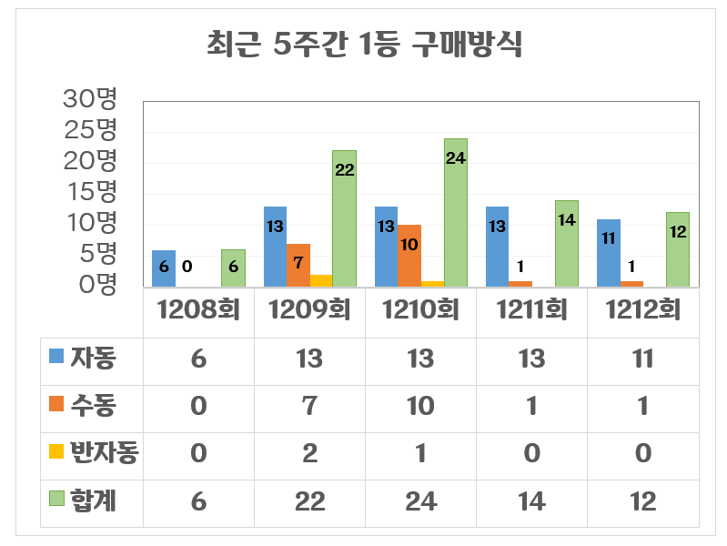 1등 당첨자 12명의 구매 방식을 보면, 자동 11명, 수동 1명, 반자동 0명으로 자동 구매 비율이 약 91.7%에 달했습니다.