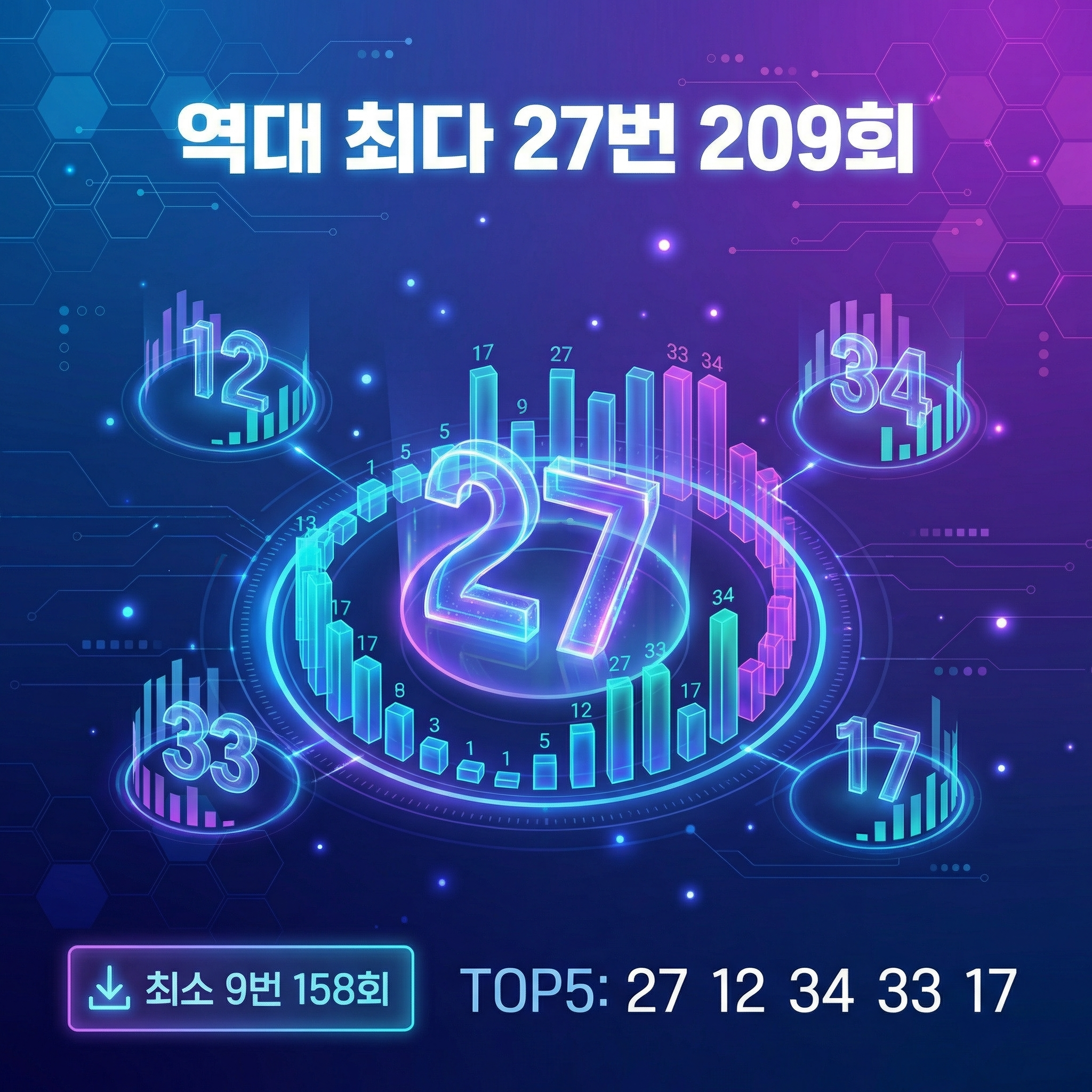역대 최다 출현 번호 27번(209회)과 최소 출현 번호 9번(158회)의 차이는 51회로, 이 격차는 통계적으로 유의미한 수준입니다.