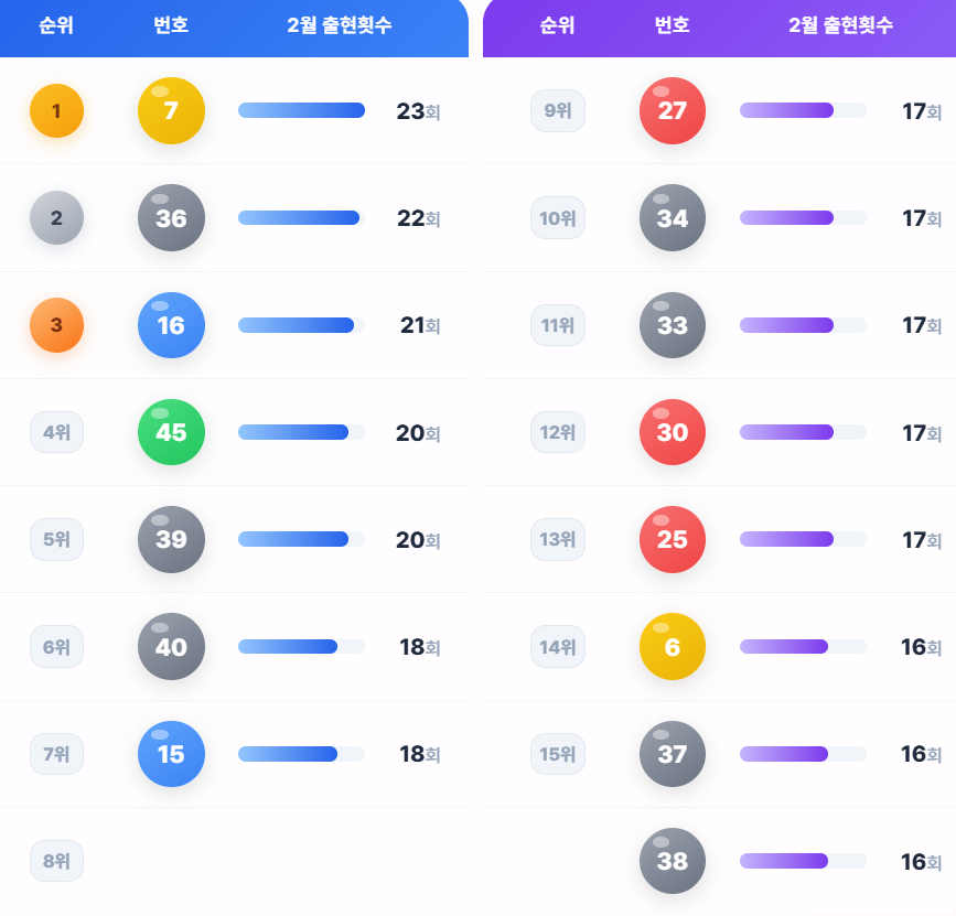 2월 통계에서 7번(23회)이 가장 많이 출현한 번호이며, 36번(22회), 16번(21회), 45번(20회), 39번(20회)이 뒤를 잇고 있습니다. 반면 32번(6회)과 11번(6회)은 2월에 가장 적게 나온 번호입니다.