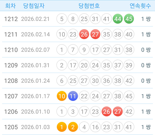 최근 5주간 연속쌍 출현 패턴을 보면, 1212회에서 44-45번 연속쌍이 나왔습니다.