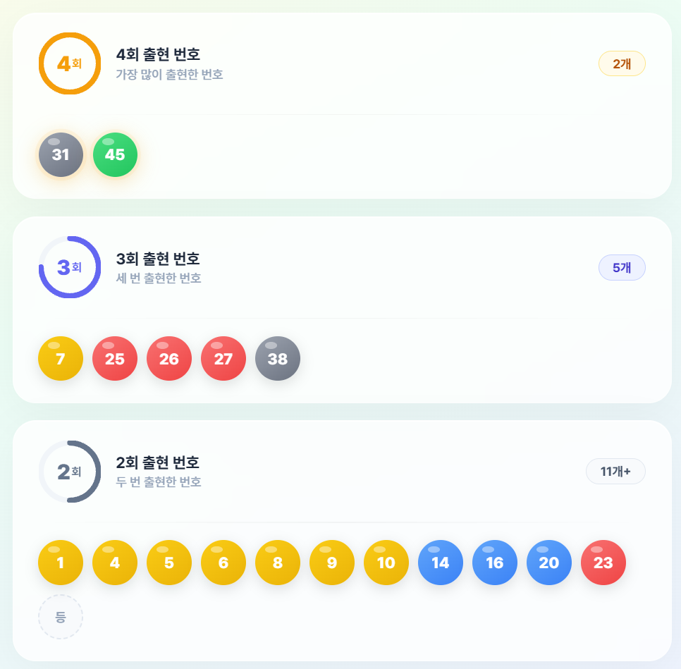 31번, 35번, 17번, 25번이 2회 출현으로 뒤를 잇고 있어, 이 번호들이 현재 핫한 번호군임을 알 수 있습니다.
