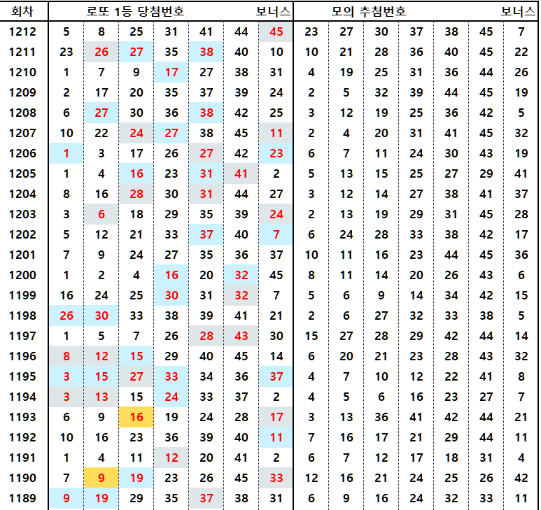 1212회에서 직전 모의번호 1개(45번)가 일치했으므로, 1213회 예상번호 선택 시 1212회 모의번호(23, 27, 30, 37, 38, 45, 7)에서 1~2개를 포함하는 것이 유리합니다.