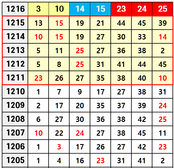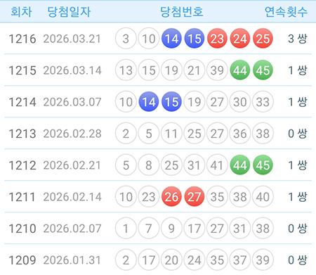 1216회 당첨번호에서는 14-15, 23-24, 24-25(보너스) 세 쌍의 연속쌍이 출현하는 이례적인 패턴이 나타났습니다.