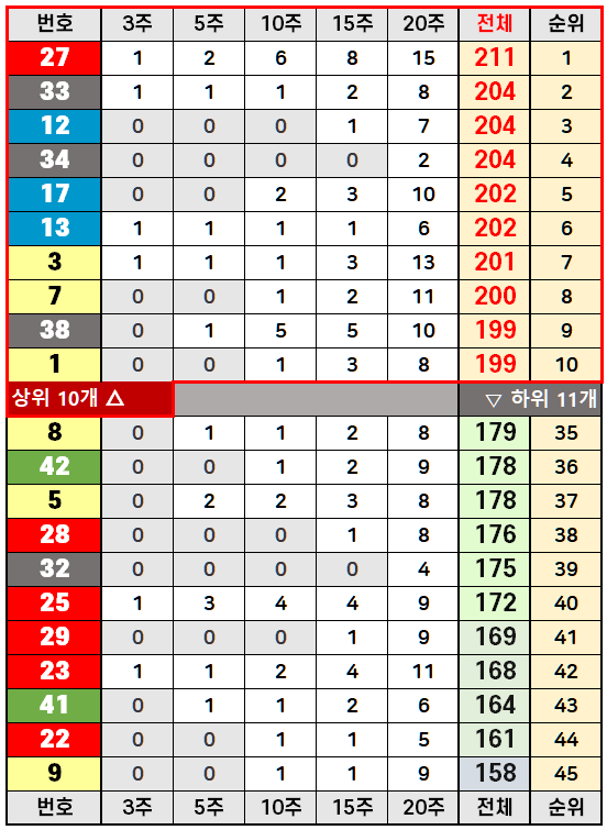 역대 상위 15개 번호: 27, 33, 12, 34, 17, 13, 3, 7, 38, 1, 24, 37, 6, 43, 20