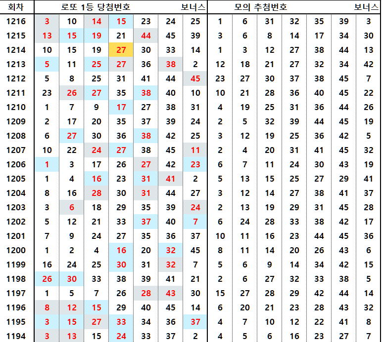 지난 1216회 로또 당첨 결과를 다각도로 살펴봅니다. 번호 특징부터 역대 통계까지 이번 주 예상번호를 뽑는 데 꼭 필요한 기초 데이터입니다.