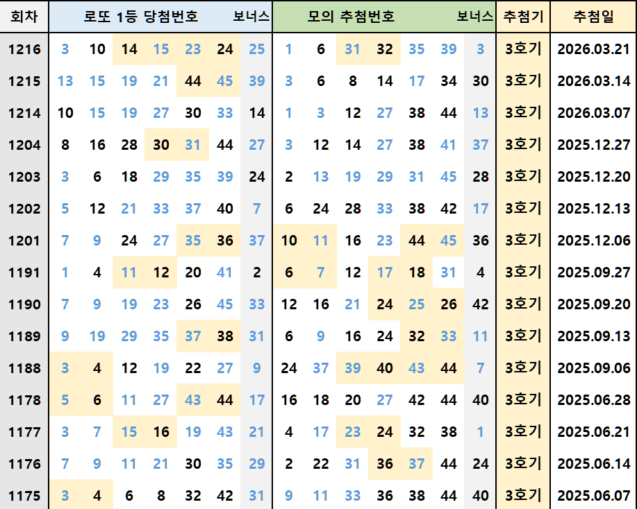 3월은 직전 모의번호가 강세를 보일 수 있다는 전망이 있으므로, 1217회 예상번호 선택 시 1216회 모의번호(월요일 오전 공개)에서 2개를 포함하는 전략을 권장합니다.