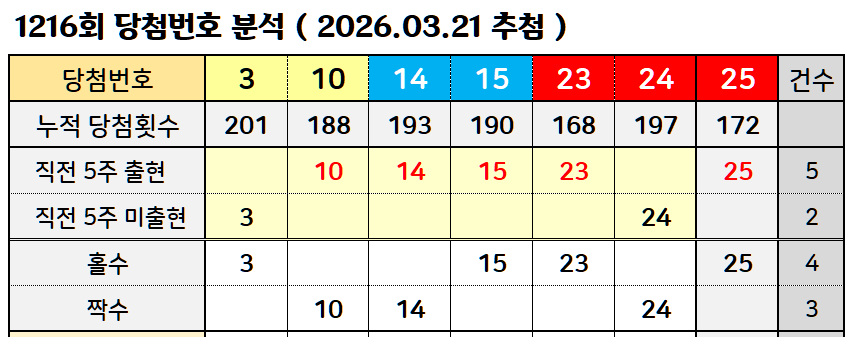 3월 28일 로또 1217회 당첨번호 발표를 대비하며 1217회 로또 당첨 예상번호 분석 시작합니다. 지난 로또 1216회 당첨번호 3, 10, 14, 15, 23, 24(보너스 25)를 바탕으로 이번 주 로또 1217회 당첨 예상번호를 상세하게 분석해드립니다. 1216회는 14-15, 23-24 두 쌍의 연속쌍(연번)이 동시에 출현하고 홀수 4개·짝수 3개 비율로 마무리된 회차였습니다.