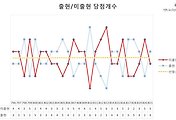 다음과 같이 번호를 추천 받았는데, 노랑색 1번대와 빨강색 20번대가 많이 보이는군요. 40번대도 많은 편이구요.